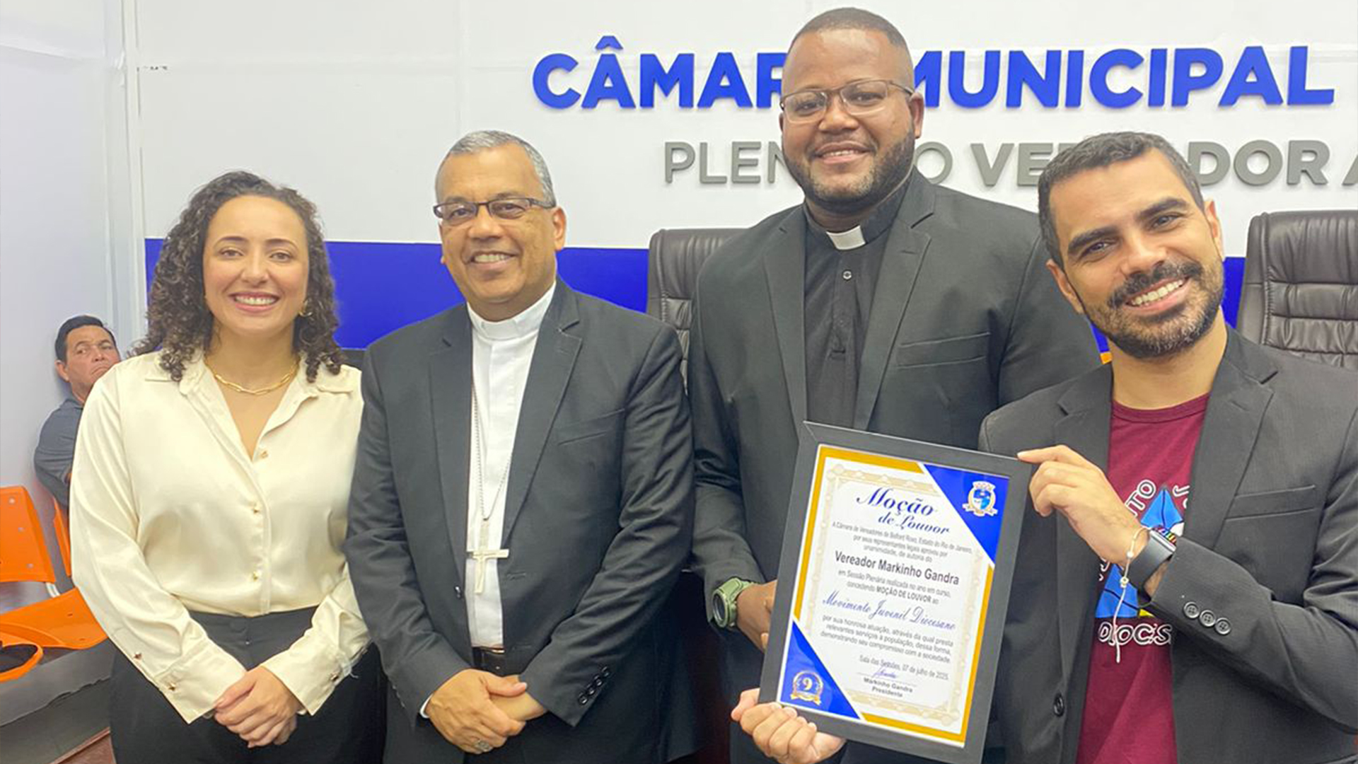 Após ser proposta, a homenagem foi aprovada por unanimidade pelos vereadores e entregue em cerimônia que reuniu lideranças religiosas e representantes do movimento. A mesa de honra foi composta por Dom Gilson Andrade da Silva, bispo diocesano; padre Ivo Gomes, pároco da Paróquia São Sebastião, em Areia Branca (Belford Roxo); Aricia Queiroz, coordenadora diocesana do MJD; e Thales Brandi, vice-coordenador.