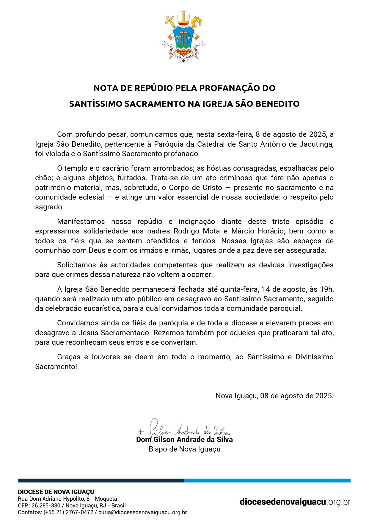 📖 Leia a nota na íntegra no site e redes oficiais da Diocese de Nova Iguaçu.