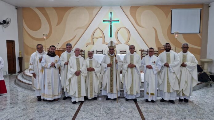 Na noite desta segunda-feira, 11 de agosto, a Diocese de Nova Iguaçu celebrou os 40 anos de ordenação presbiteral de quatro padres do clero diocesano: Edemilson Figueiredo, pároco da Paróquia São José Operário; Marcus Barbosa, atualmente em serviço como assessor da Comissão Episcopal para o Ecumenismo e o Diálogo Inter-Religioso na Conferência Nacional dos Bispos do Brasil (CNBB); Porfírio Fernandes; e Clínio José Drago, que está em missão na Diocese de Colatina (ES) e, devido aos cuidados com sua saúde, não pôde estar presente à celebração.