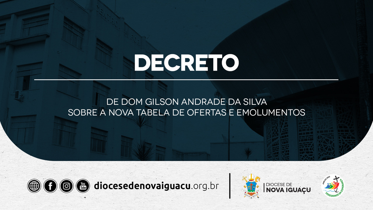 A Diocese de Nova Iguaçu publicou, nesta segunda-feira (25), decreto do bispo diocesano, Dom Gilson Andrade da Silva, que estabelece a nova Tabela de Ofertas e Emolumentos a ser observada em todas as paróquias e comunidades. O documento, elaborado em consonância com o Código de Direito Canônico e com as orientações da Província Eclesiástica de São Sebastião do Rio de Janeiro, busca uniformizar os valores referentes às contribuições espontâneas dos fiéis nas celebrações dos sacramentos e demais atos pastorais.