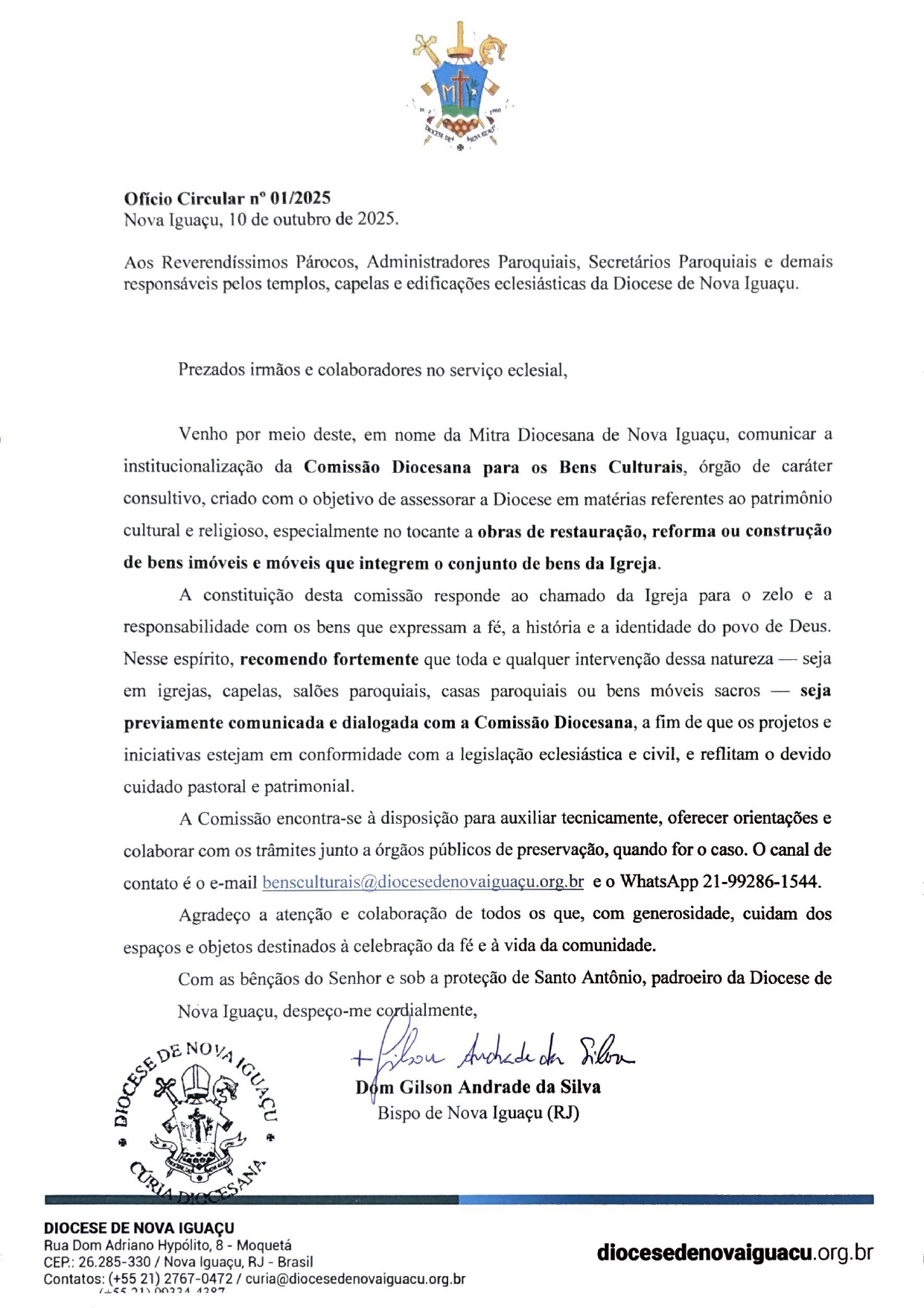 Nova Iguaçu (RJ) — O bispo diocesano de Nova Iguaçu, Dom Gilson Andrade da Silva, publicou nesta sexta-feira (10) o Ofício Circular nº 01/2025, que oficializa a criação da Comissão Diocesana para os Bens Culturais. O novo órgão, de caráter consultivo, tem a missão de assessorar a Mitra Diocesana em temas relacionados ao patrimônio cultural e religioso, com atenção especial às obras de restauração, reforma ou construção de bens móveis e imóveis pertencentes à Igreja.