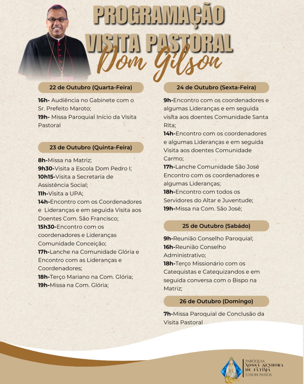 A partir desta quarta-feira, 22 de outubro, o bispo de Nova Iguaçu, Dom Gilson Andrade, realiza Visita Pastoral à Paróquia Nossa Senhora de Fátima, em Edson Passos. Ao longo de cinco dias de atividades, o pastor diocesano estará presente em diversas comunidades, celebrando missas, participando de reuniões com lideranças, visitando instituições locais e promovendo momentos de escuta e comunhão.